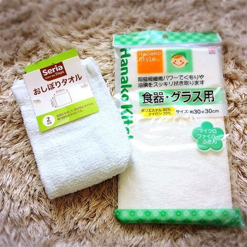 セリアで『おしぼりタオル』(写真左)という商品を購入しました。 大きさといい薄さといい台拭きにピッタリな感じだったんです。 何より真っ白というのが気に入りました◎ 大きさは28㎝×30㎝です。 広げると、こんな感じです。 今使っている台拭きは大きさや…